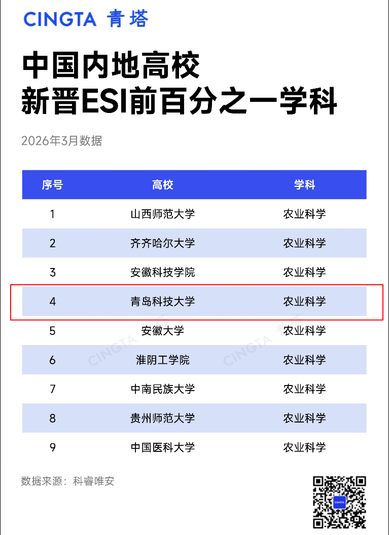 近日,科睿唯安(Clarivate Analytics)最新ESI(Essential Science Indicators)学科排名数据公布,谈球吧网页版登录入口农业科学学科成功跻身ESI全球前1%,标志着该学科国际学术影响力与科研水平迈上新台阶,这是公司继化学、工程学、材料科学等学科之后,第7个进入ESI全球前1%的学科。