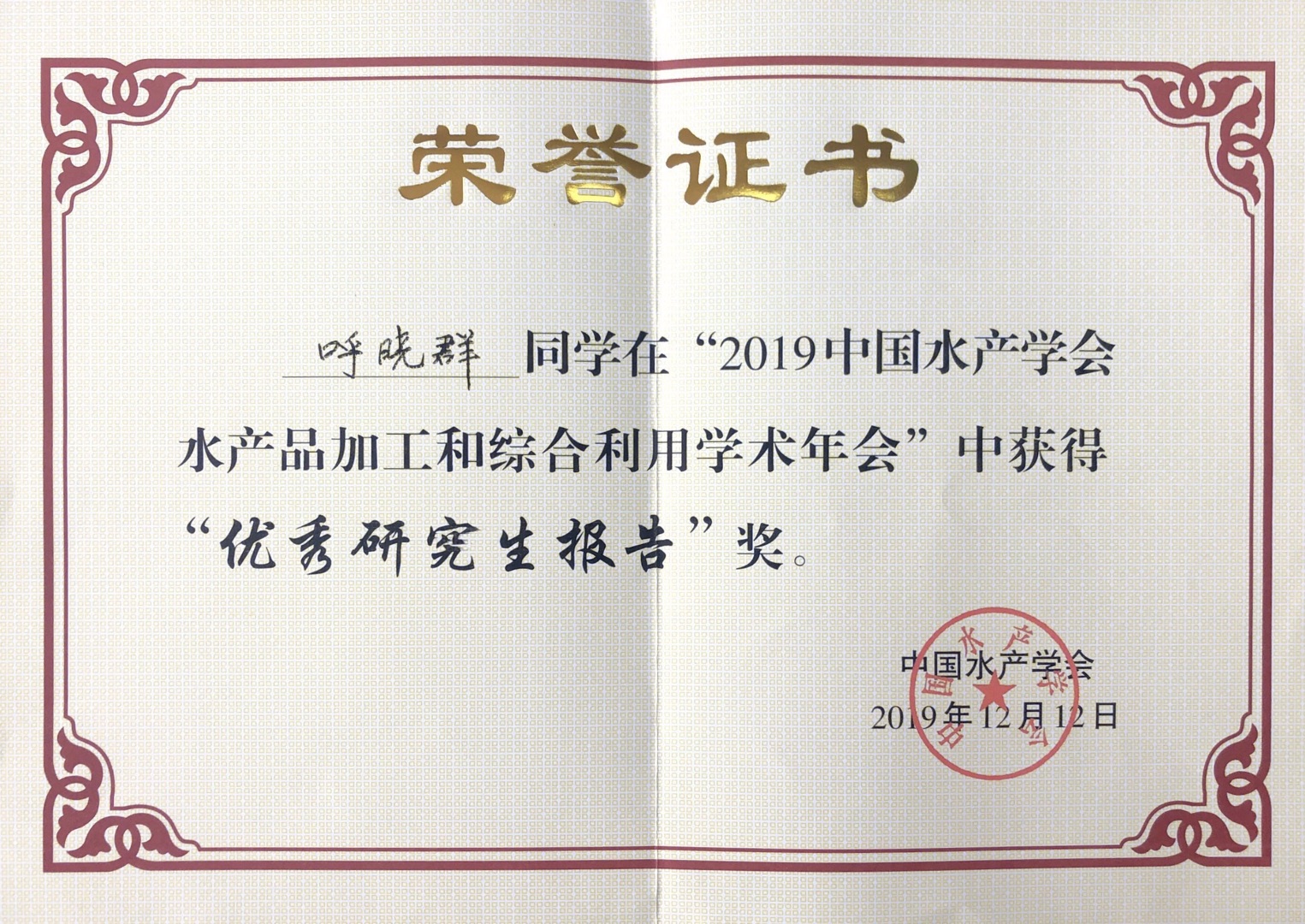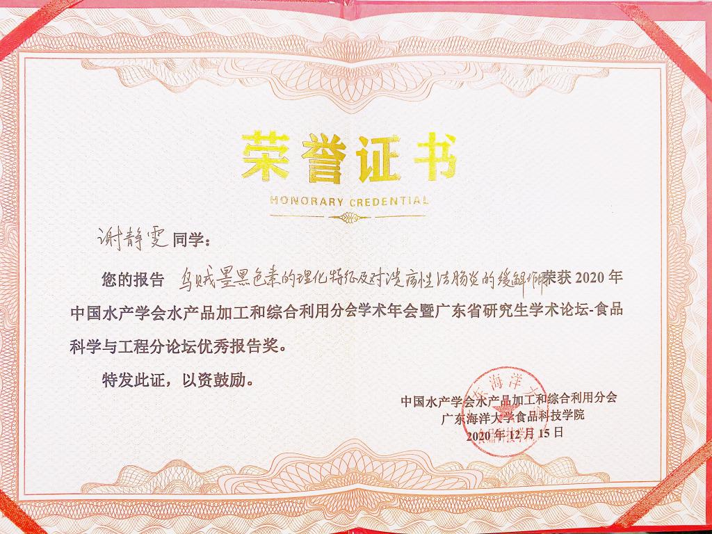 2020年12月14-16日,由中国水产学会水产品加工与综合利用分会主办,广东海洋大学承办的“2020年中国水产学会水产品加工与综合利用分会学术年会”在广东湛江隆重召开。年会以“蓝色、营养、安全、健康”为主题。会议设置特邀专家报告、特邀青年学者报告、专题报告和研究生论坛,参加单位87家,参会嘉宾500余人,共同探讨水产品加工与安全控制的前沿技术与发展趋势,增强水产品加工科技自主创新能力,促进我国水产加工产业的转型升级和持续发展。此次会议的研究生论坛共推选125名研究生进行论坛交流,公司轻工技术与工程2019级硕士研究生谢静雯同学的报告“乌贼墨黑色素的理化特征及对溃疡性结肠炎的缓解作用”成为此次评选出的15名优秀报告奖之一。