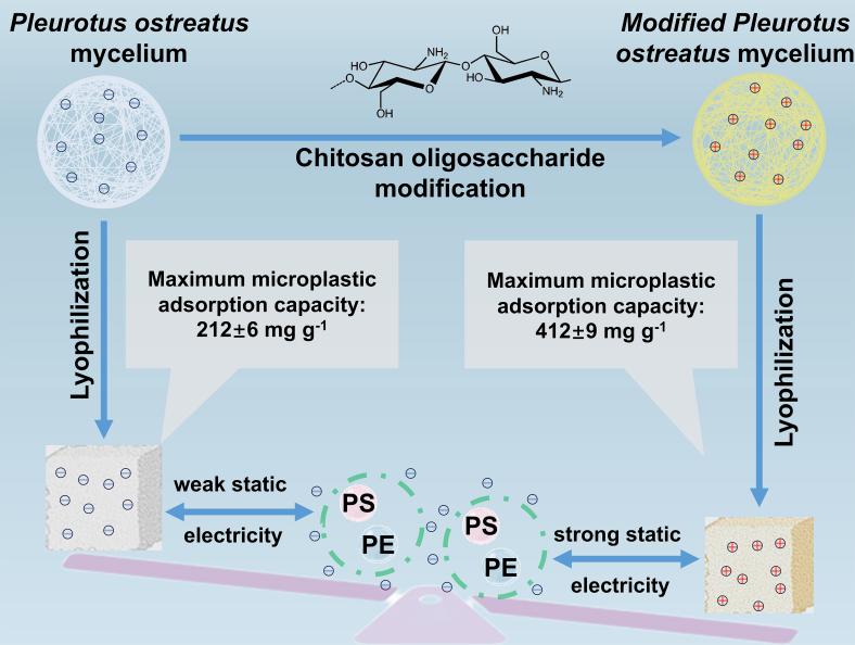 针对水中微塑料的治理难题,团队创新性地提出了一种基于改性可食用真菌平菇的去除方法,选用绿色可食、经济易得的平菇菌丝体构建微塑料去除框架,以天然物质壳聚糖和柠檬酸对其改性,得到改性菌丝体(M-PM)海绵。1 g M-PM可去除412.42±9.14 mg MPs,常温下,其对自来水样品中MPs的去除率高达68.8%,对其他水样的去除率也可达60.1%~67.4%。该材料的优异性能主要源于内部的结构交联与表面的阳离子化修饰。此外,M-PM具备良好的生物相容性,整个制备和使用过程绿色无污染。相关研究成果以题为《Chitosan oligosaccharide-modified Pleurotus ostreatus mycelium for microplastic removal based on the green design concept》的论文,发表于国际期刊《Industrial Crops and Products》(JCR一区,IF=6.2)。论文第一作者为谈球吧硕士研究生董新睿,谈球吧网页版登录入口为第一单位,通讯作者为王霞副教授。