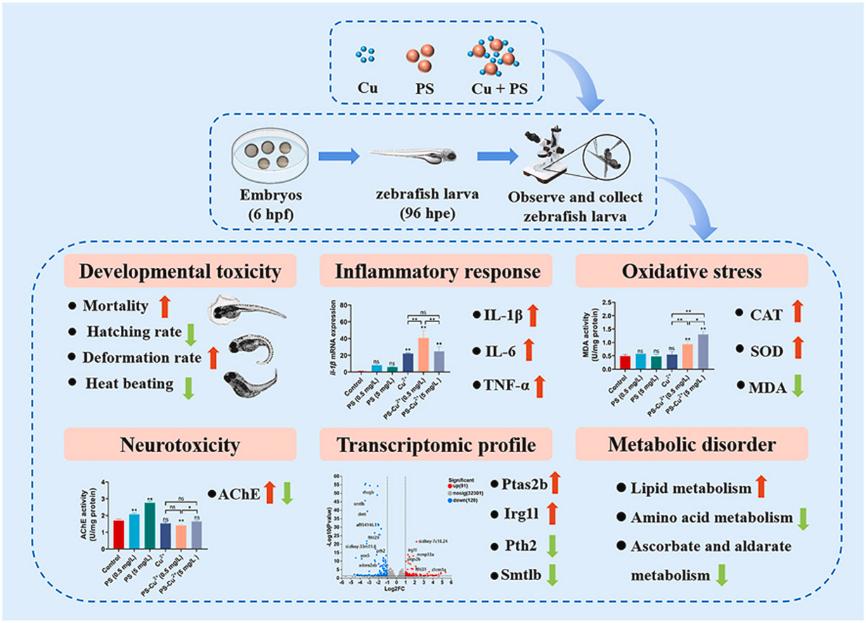 微塑料毒性评估模型系统评估了10μm聚苯乙烯微塑料(PS-MPs)与铜(Cu)联合暴露对斑马鱼幼鱼的急性毒性效应。结果证实,联合暴露会诱导斑马鱼产生发育毒性、免疫毒性、神经毒性,并引发氧化应激与代谢紊乱,且两者表现出显著的协同毒性效应。该研究首次揭示了微塑料与铜对斑马鱼幼鱼的急性联合毒作用机制,相关成果以题为《Polystyrene microplastics (PS-MPs) harness copper presence and promote impairments in early zebrafish (Danio rerio) larvae: Developmental, biochemical, transcriptomic approaches and nontargeted metabolomics approaches》的研究论文,发表于国际期刊《Environmental Research》(JCR一区,IF=7.7)。论文第一作者为谈球吧硕士研究生张丽巧,谈球吧网页版登录入口为第一单位,通讯作者为王霞副教授。