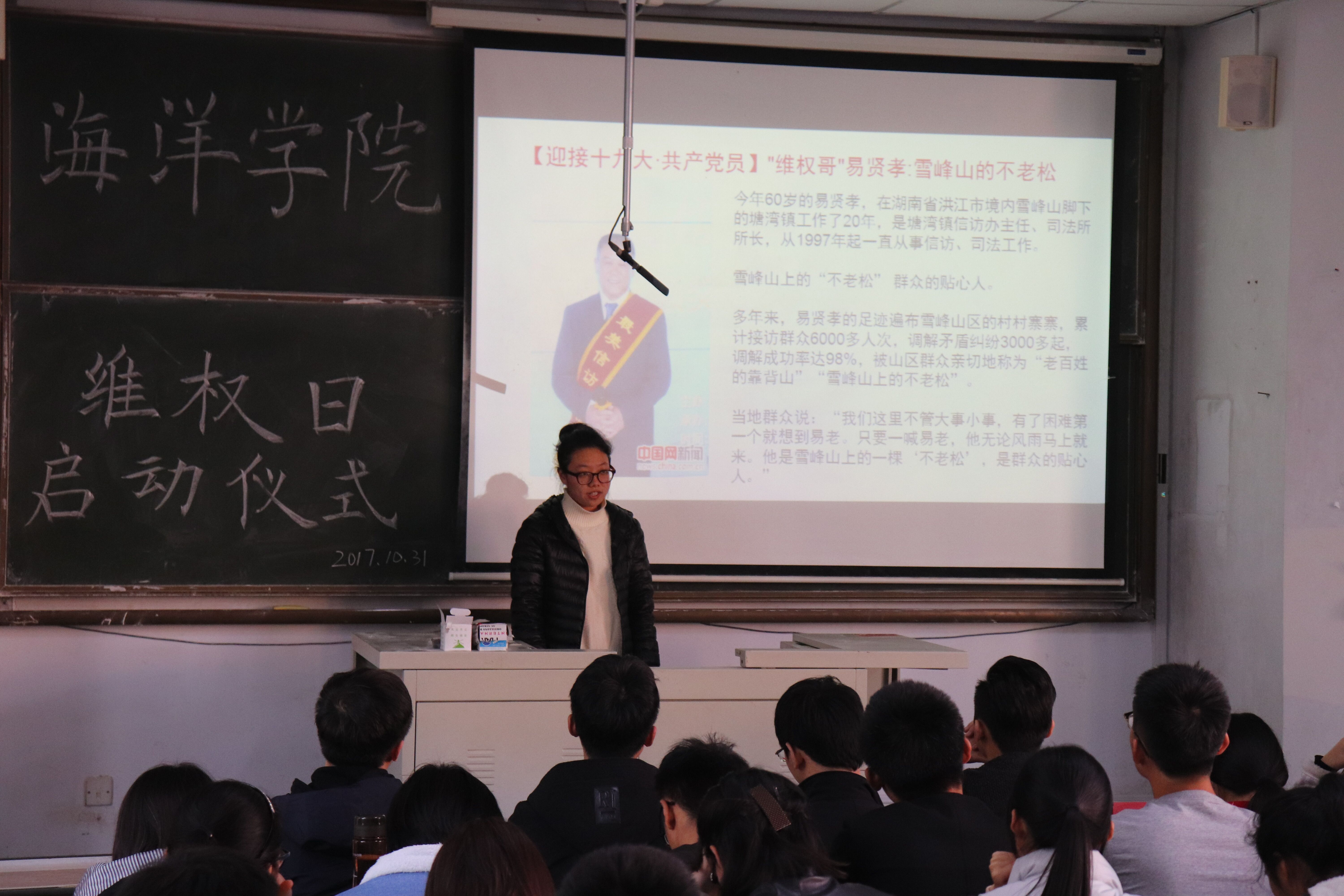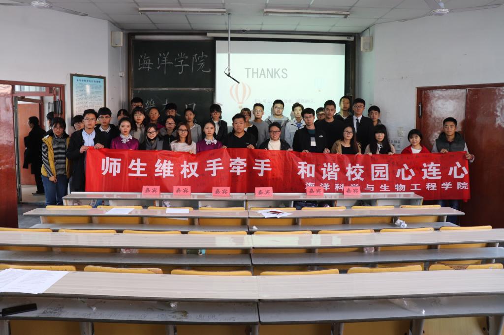 为了切实做好员工权益保障工作、了解民情民意,10月31日下午两点,海洋公司维权日启动仪式在一教301隆重举行,海洋公司副主席付洪喜、杨文艺、陈震,纪检部部长王炳威以及海洋公司15级、16级、17级各班生活委员和舍长等员工干部参加了本次启动仪式。