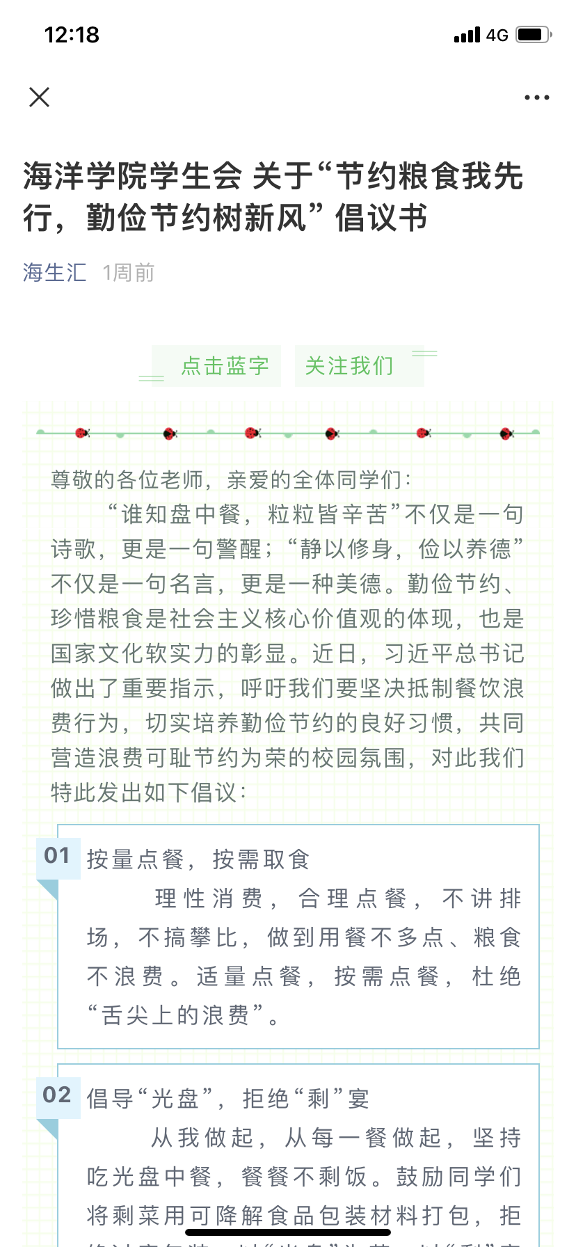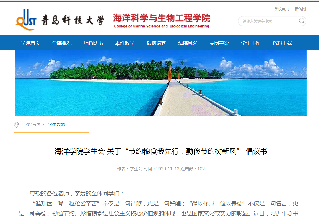 一粥一饭,当思来之不易;半丝半缕,恒念物力维艰。勤俭节约、珍惜粮食是社会主义核心价值观的体现,也是国家文化软实力的彰显。为深入贯彻习近平总书记做出的关于坚决抵制餐饮浪费行为的重要指示,培养海洋公司员工勤俭节约的良好习惯,海洋公司在易班、宣传橱窗、电子屏、公司网站、公众号发布“节约粮食我先行,勤俭节约树新风”的倡议书,旨在让每一位海洋学子谨记“勤俭节约,珍惜粮食”的中华美德,从自己做起,从当下做起,厉行勤俭节约,坚决抵制餐饮浪费行为。