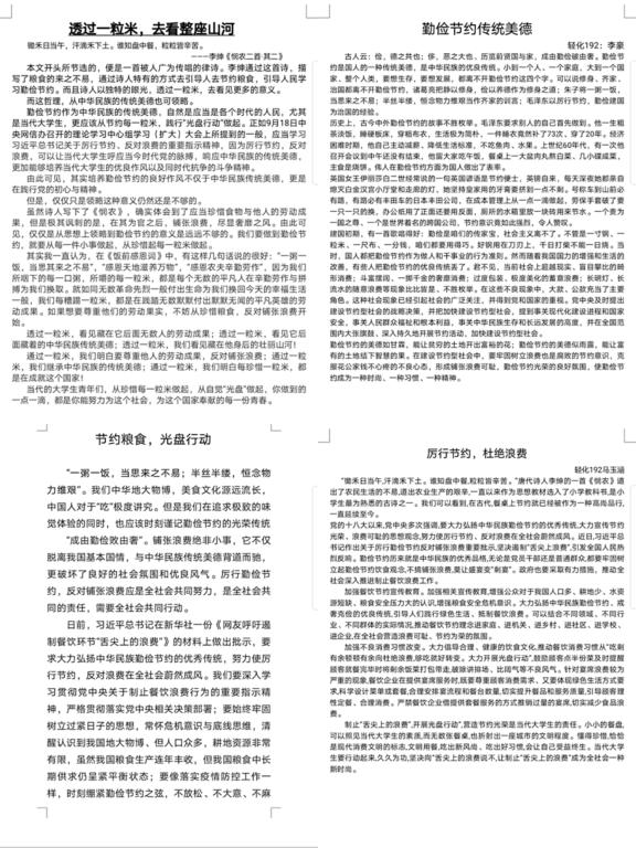 为加大宣传力度,将“勤俭节约,珍惜粮食”的思想深入落实,公司组织开展“节约粮食”主题征文,力求以文字的方式,深化同学们对勤俭节约,杜绝浪费的认识。