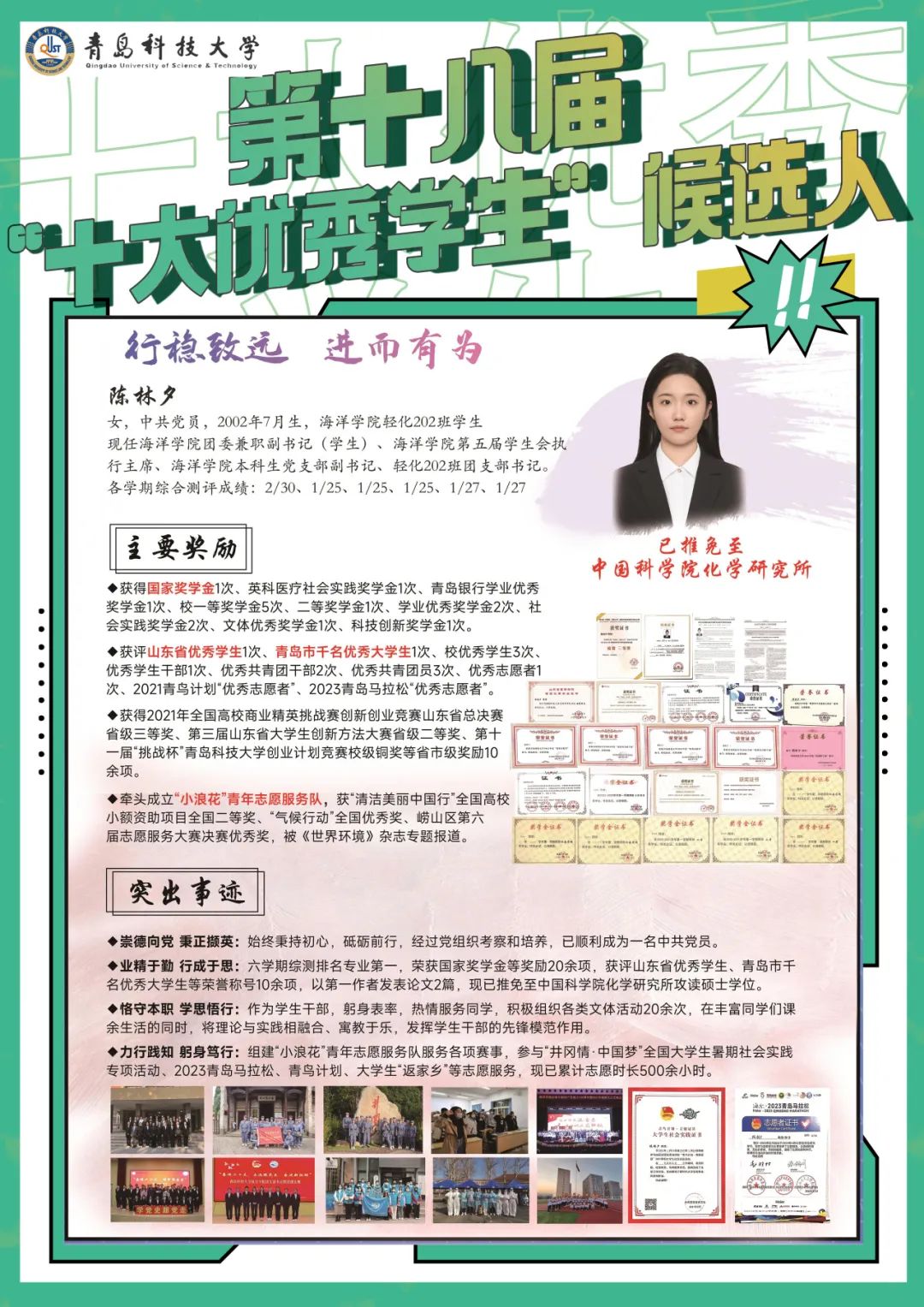 陈林夕坚持严谨的学习态度,六学期综测排名专业第一,平均学分绩点:3.59,90分以上课程20门以上,现已推免至中国科公司化学研究所攻读硕士学位。荣获国家奖学金1次,英科医疗奖学金1次,青岛银行奖学金1次,一等综合奖学金5次,二等综合奖学金1次,社会实践奖学金2次、文体优秀奖学金1次、学业优秀奖学金2次、科技创新奖学金1次,累计获得奖励20余项。获评山东省优秀员工1次,青岛市千名优秀老员工1次,校优秀员工3次。大大小小的奖项背后,是她对专业知识学习的踏实与勤奋,也是初心不改的执着和坚守。