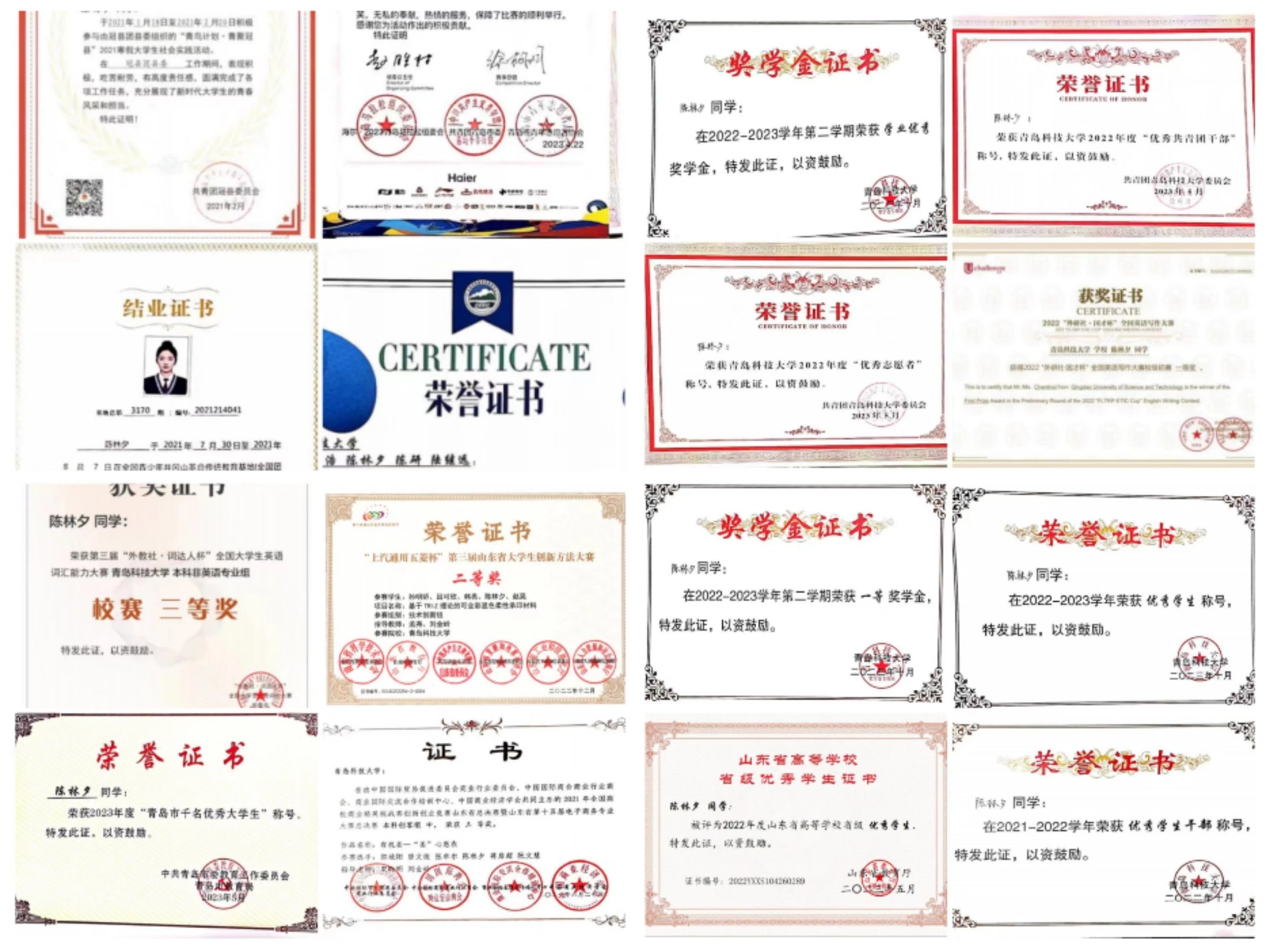 获国家奖学金、青岛银行学业优秀奖学金、英科医疗社会实践奖学金、一等综合奖学金5次、二等综合奖学金1次、学业优秀奖学金2次、科技创新奖学金等奖励20余次;获山东省优秀员工、青岛市千名优秀老员工、优秀员工干部、优秀团干部、优秀共青团员等荣誉称号。
