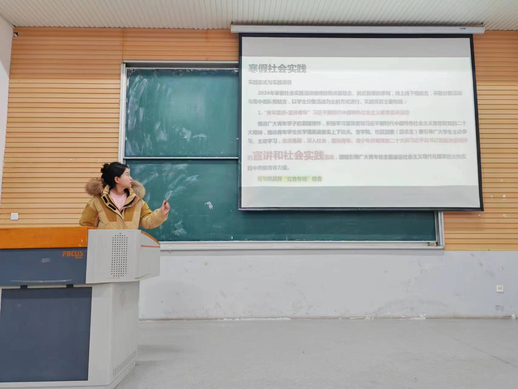 第二部分,郭颖就寒假社会实践活动进行说明,从实践形式与实践项目入手,结合四项具体实践活动展开讲解,最后落脚到成果总结评定与上报方面。全方位、全过程、立体化地向同学们展示了寒假社会实践活动的方方面面,呼吁同学们提早规划,尽早准备。