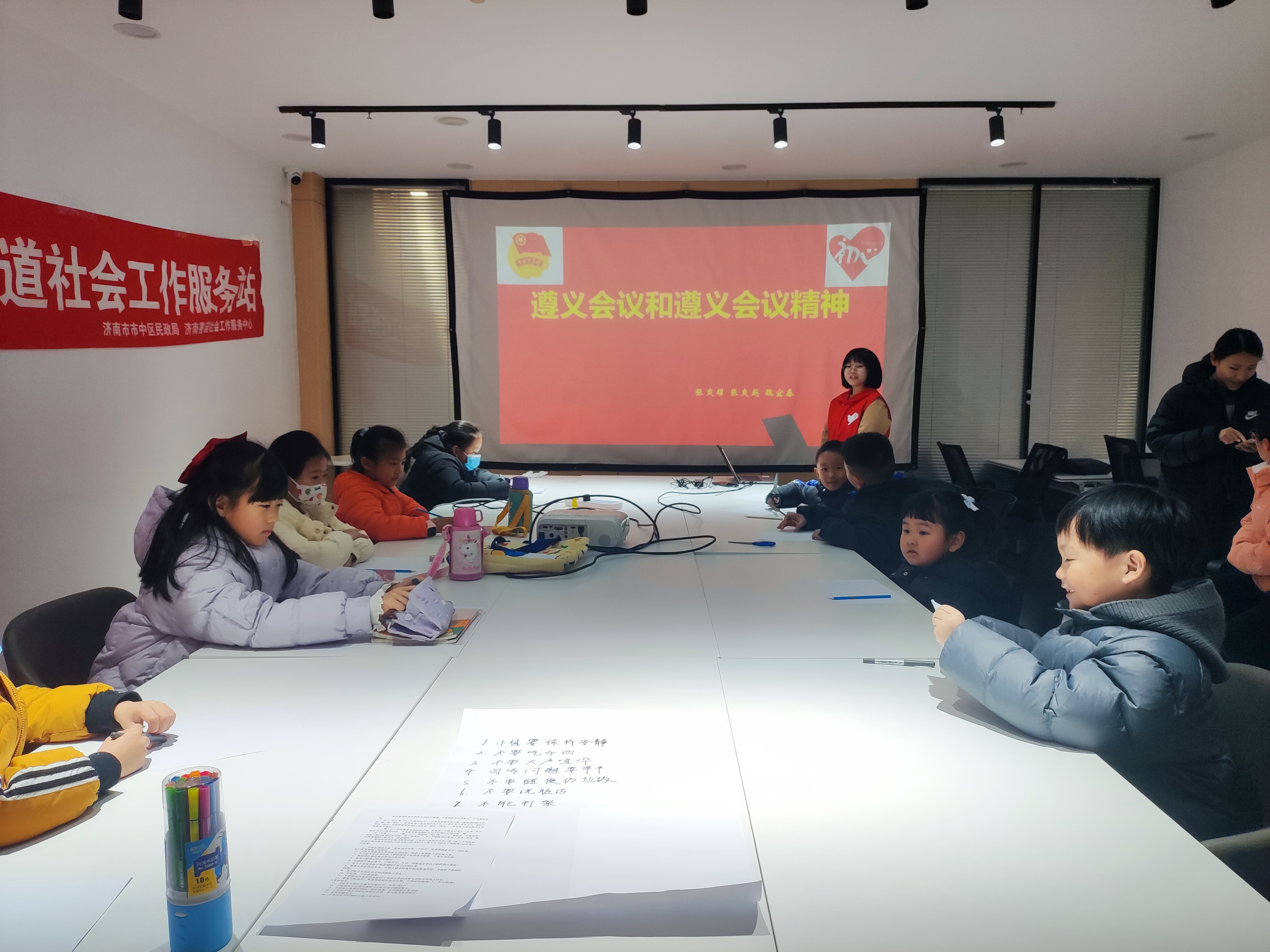 我于2024年1月29日开始参加山东省济南市十六里河街道的志愿服务活动。下午,我来到十六里河街道办事处,在社区工作人员的带领下去往鲁能领秀公馆参与寒假公益课堂活动。我的服务内容主要有以下几方面:给员工授课;带领员工参与剪窗花、游戏等趣味活动;辅导员工作业。看似简单的事情,我也提前进行了充足的备课,当真正开始讲课时,我却有些慌神,深吸一口气之后才平复下来。之前我所授课的大部分是年龄大一些的员工,第一次去给一二年级的小同学进行讲课,我本有些犹豫——这么小的孩子,真的能听懂我在讲什么吗?思考了很久,又去询问了有经验的周边同学,我决定在授课过程中插入动画《那年那兔那些事》中契合的片段,我自己在旁边解说,帮助小同学们理解。我怀着忐忑的心情,开始逐渐引入主题,孩子们的热情却真的出乎意料,反应很热烈。他们非常捧场,积极回应我的问题,不仅很快地记住了我所讲的内容,还能举一反三和我互动,问我问题,拿着纸笔要记笔记。他们很天真,一个男生还不会写字,比着字儿抄,歪歪扭扭的字迹里倾泻出的是满满的认真。我第一次被这么多双流露出求知意愿的眼睛盯着,自豪与责任感油然而生,我的怯懦与紧张便渐渐消散。看到员工们好奇的眼神与开心的笑容,我也多了许多欣慰之情。