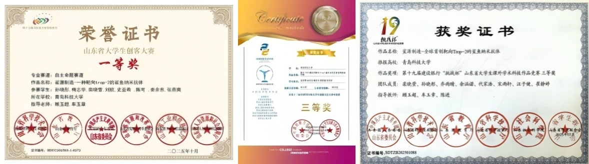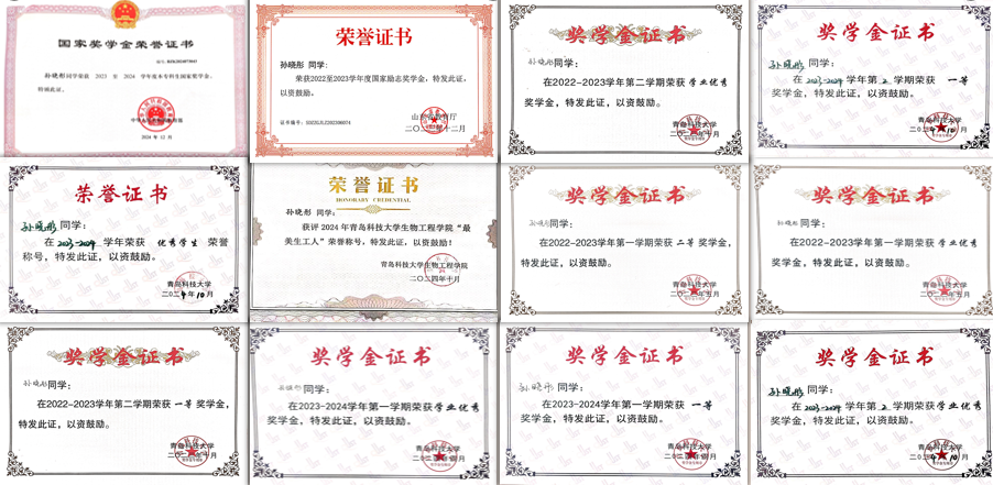 国家奖学金、全国老员工英语竞赛国家级二等奖、第十二届中国TRIZ杯创新方法大赛国家级二等奖、第十一届中国TRIZ杯创新方法大赛国家级三等奖、中国国际老员工创新创业大赛省级银奖两项、挑战杯山东省老员工课外学术作品展示竞赛省级铜奖、山东省老员工创新方法大赛省级三等奖两项、山东省老员工创客大赛省级一等奖三项、山东省老员工化工过程创新设计竞赛省级三等奖两项。获校级一等综合奖学金、学业优秀奖学金、二等综合奖学金、科技创新奖学金等奖励二十余项;获青岛市千名优秀老员工、校级优秀员工、校级优秀员工干部、校级优秀共青团员、“最美海洋人”“最美生工人”等荣誉称号十余项。