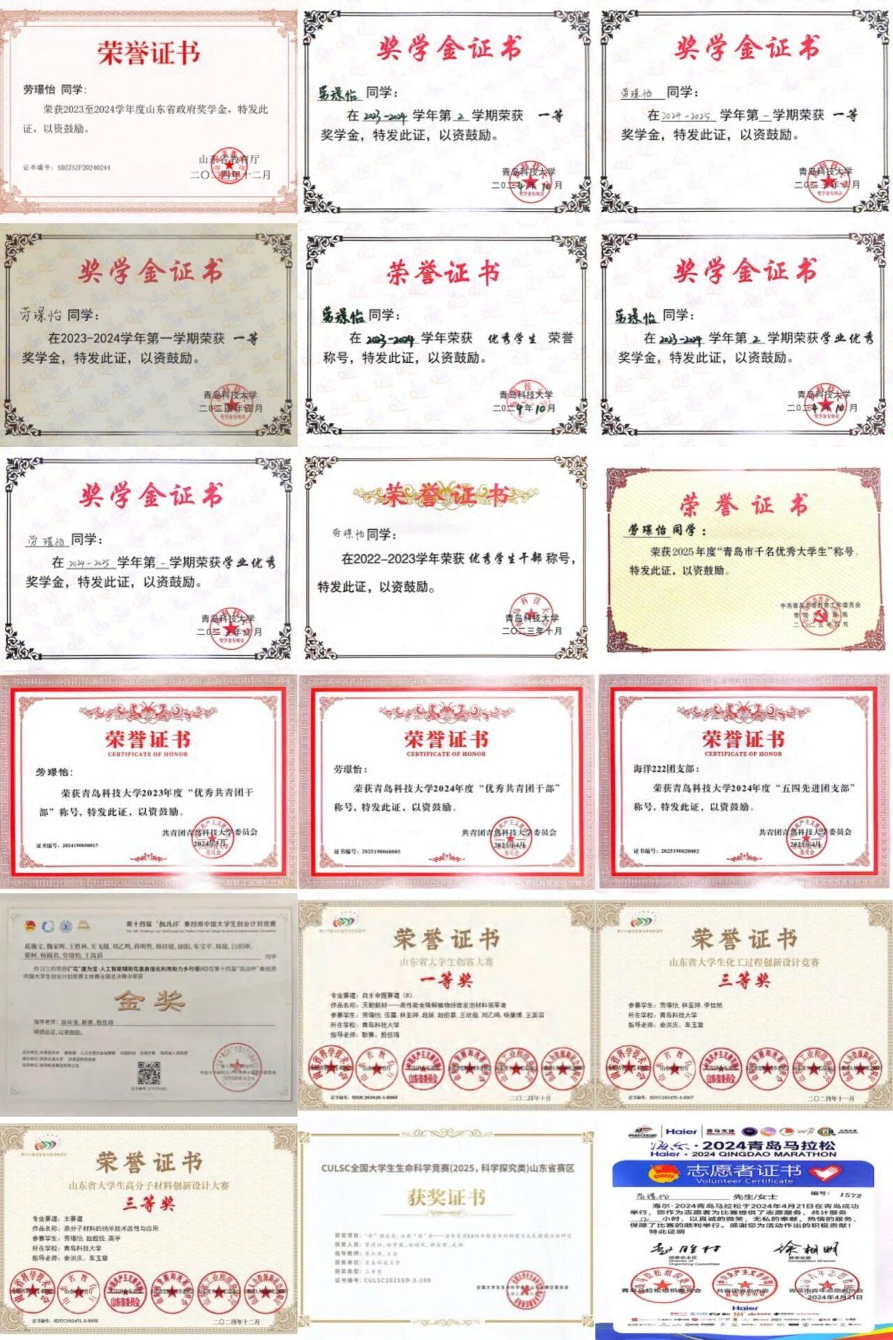 荣获“挑战杯”秦创原创新挑战赛国家级金奖、中国国际老员工创新大赛省级银奖、山东省老员工创客大赛一等奖、山东省复合材料大赛三等奖、第十届全国老员工生命科学竞赛(科学探究类)省级三等奖、山东省老员工创新方法大赛三等奖、2025年老员工创新创业训练项目省级立项等。