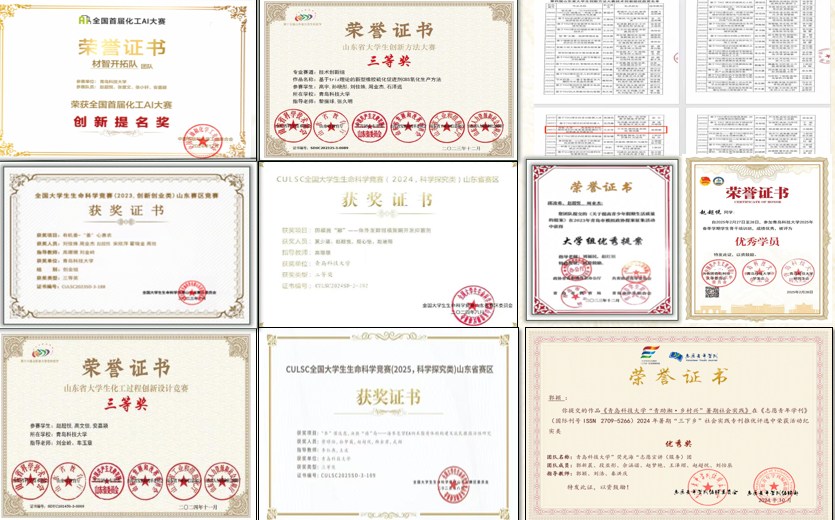 荣获全国首届化工行业人工智能大赛(负责人)国家级创新提名奖、第九届全国老员工生命科学竞赛,省级二等奖、第四届山东省老员工创新方法大赛省级优胜奖、山东省老员工化工过程创新设计竞赛(负责人)省级三等奖、第十届全国老员工生命科学竞赛省级三等奖、第十四届“挑战杯”校级二等奖。