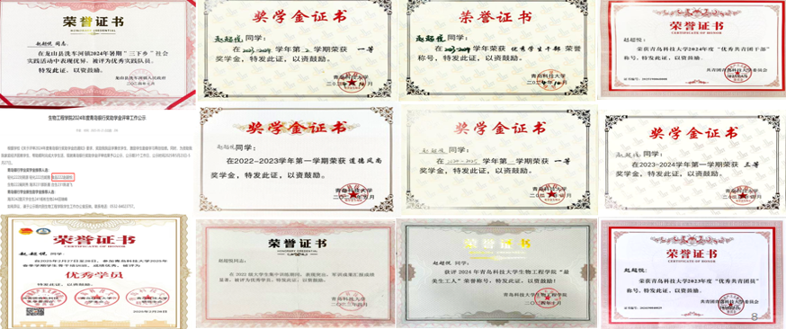 获国家奖学金、青岛银行奖学金、一等综合奖学金、二等综合奖学金、学业优秀奖学金、文体优秀奖学金等奖励10余项;