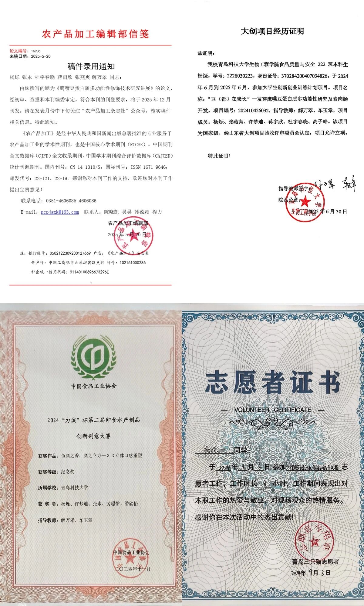荣获2024年老员工创新创业训练计划国家级立项(第一负责人)、“力诚”杯第二届即食水产制品创新创意大赛优秀纪念奖(第一负责人)、山东省老员工创客大赛省级二等奖,以第一作者撰写论文《鹰嘴豆蛋白质多功能性修饰技术研究进展》一篇,录用于《农产品加工》期刊;