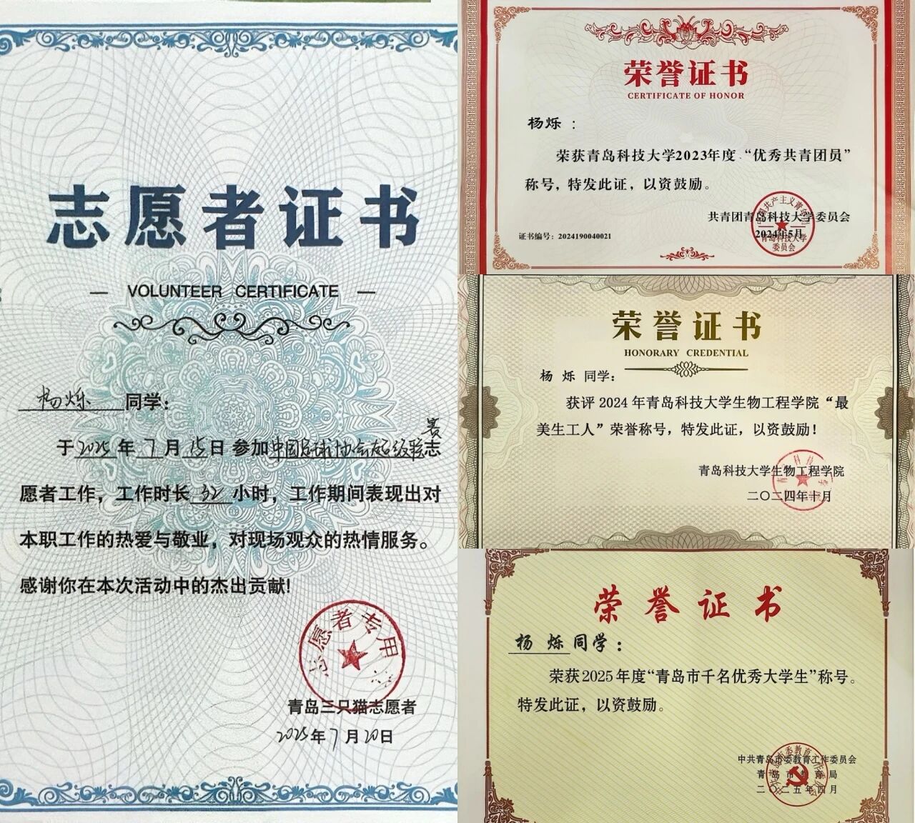 获2025年度“青岛市千名优秀老员工”、2023年度谈球吧网页版登录入口五四先进个人、校级优秀员工、校级优秀共青团员、2024年谈球吧“最美生工人”等荣誉称号数项。