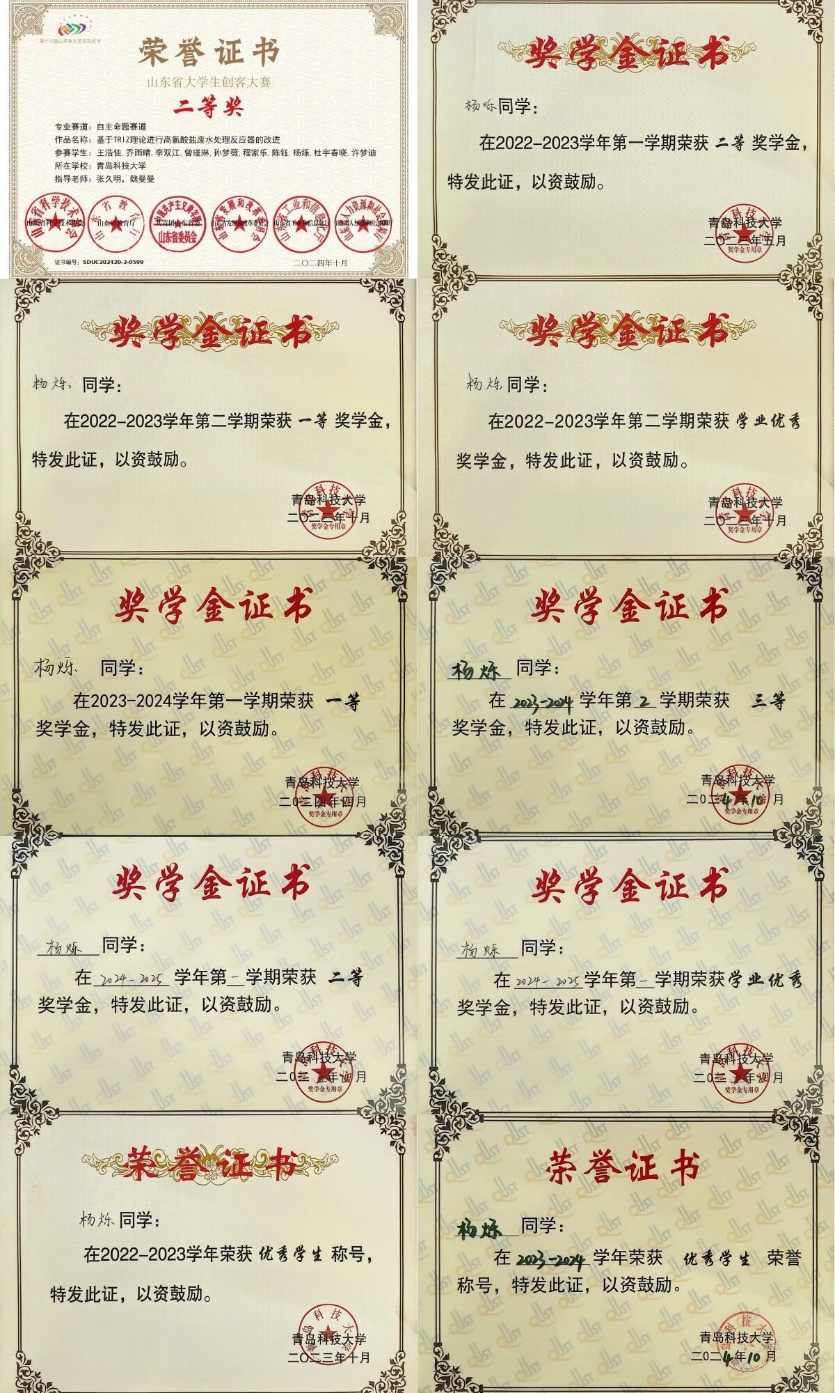 获一等综合奖学金、二等综合奖学金、三等综合奖学金、学业优秀奖学金等奖励十余项;