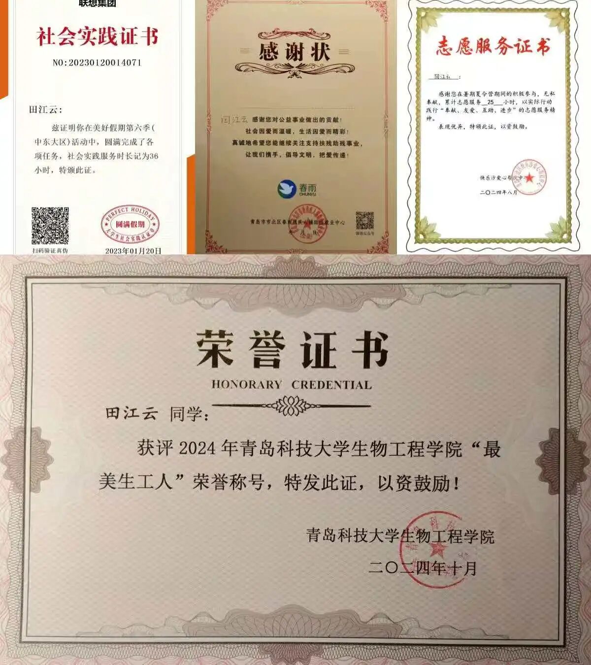 获校级优秀员工、校级优秀员工干部、校级优秀青年志愿者、校级社会实践优秀员工、最美生工人等荣誉称号;