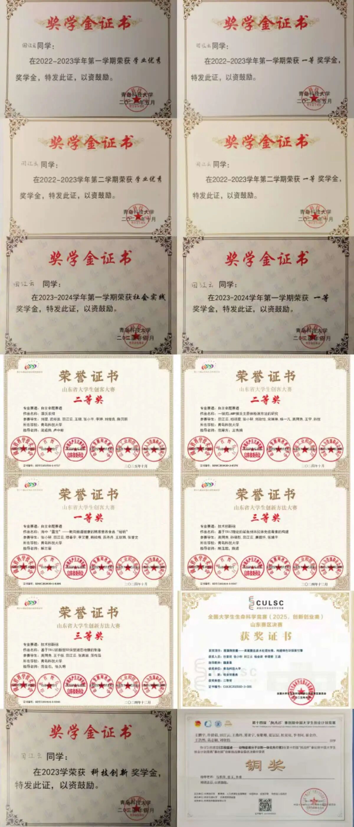 荣获国家奖学金、综合一等奖学金、学业优秀奖学金、国家励志奖学金、"焦奎·中科深蓝汇泽”奖学金、青岛银行学业奖学金、科技创新奖学金等奖励20余项;