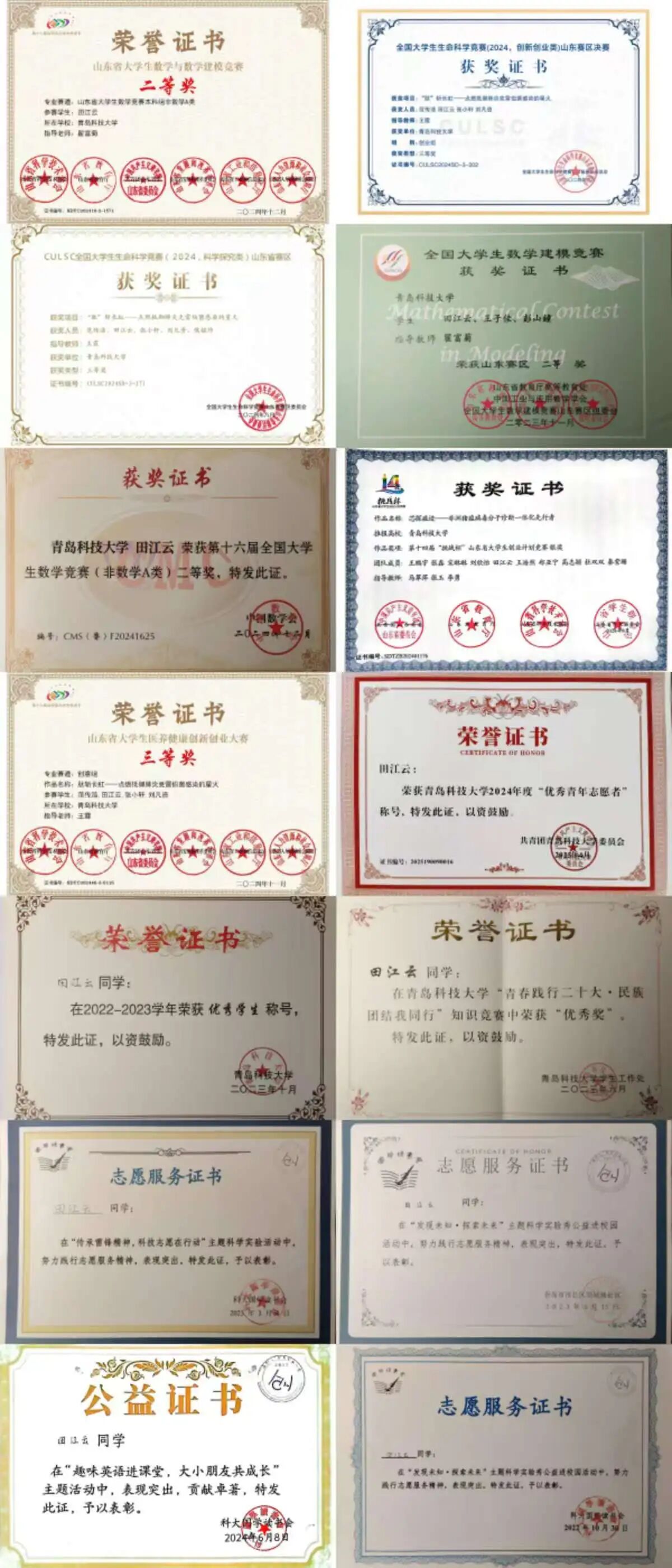 荣获“挑战杯”秦创原创新挑战赛国家级铜奖、全国老员工数学竞赛国家级二等奖、全国老员工数学建模竞赛省级二等奖、中国国际老员工创新大赛省级铜奖、第十四届“挑战杯”老员工创业计划竞赛主赛道省级银奖、山东省老员工医养健康创新创业大赛三等奖、山东省老员工创客大赛一等奖,二等奖、第九届全国老员工生命科学竞赛(科学探究类)省级三等奖、山东省老员工创新方法大赛三等奖、第十届全国老员工生命科学竞赛(创新创业类)省级三等奖、2024年老员工创新创业训练项目省级立项(负责人)等。