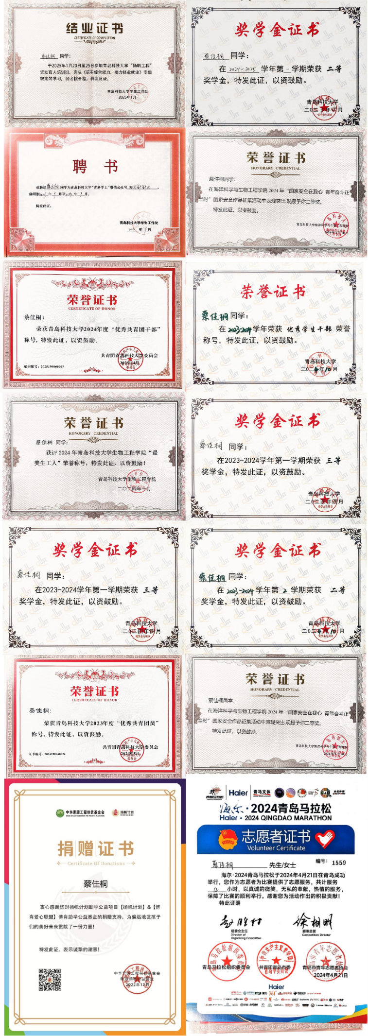 2024年老员工创新创业大赛省级立项(负责人),山东省老员工创客大赛二等奖两项(其中一项为负责人),山东省老员工化工过程创新设计竞赛三等奖(负责人),校挑战杯二等奖。