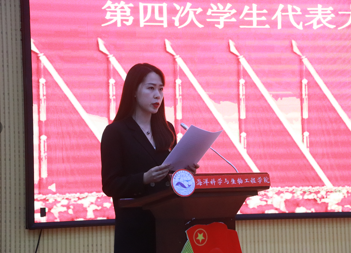 会上第三届员工会主席团代表靳羽欣同学作《坚定信念锐意进取实事求是勇于实践为实现“海洋强国”战略目标贡献“青科大海洋人”的青春智慧和力量》工作报告。