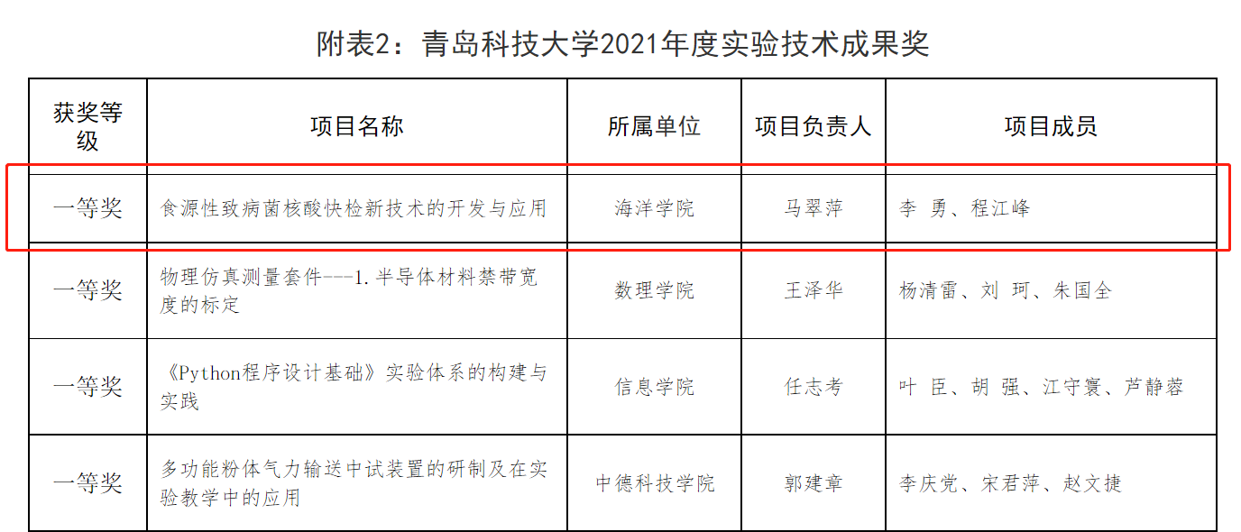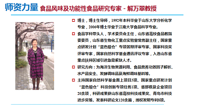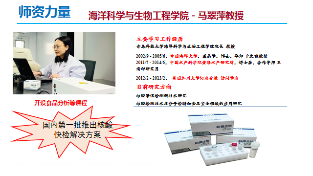 食品质量与安全专业适应当前食品安全、食品营养与健康国家战略发展需求,服务于山东区域经济社会发展,依托青岛蓝色硅谷海洋科技优势,在食品中生物危害物快速识别与检测、海洋食品营养品质高值化利用等科技创新成果高效转化方面优势特色明显。先后获批青岛市核酸快检工程研究中心、青岛市海洋生物活性物质与精准营养食品工程研究中心和青岛市海洋生物活性因子健康食品工程技术协同中心等科研平台。马翠萍教授团队研发的食品核酸检测试剂盒在北京冬奥会食品安全检测项目中中标,为北京2022年冬奥会食品安全环节提供了科学保障和有力支持。