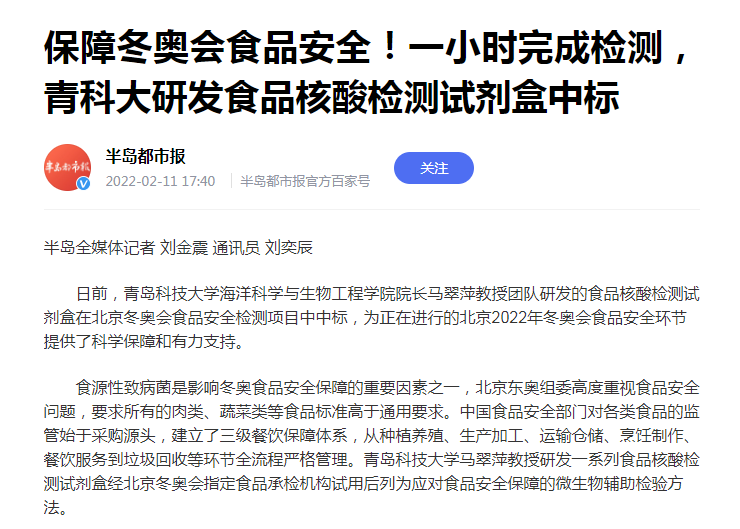食品核酸检测试剂盒中标北京冬奥会食品安全检测
