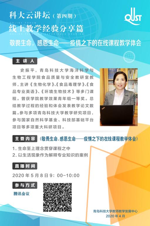 2020年5月8日上午9时,海洋公司教师史振平在第“四期科大云讲坛”开展“敬畏生命,感恩生命——疫情之下的在线课程教学体会”经验交流。史老师从“在课程过程中贯穿生命至上理念、以生活现象作为解释专业知识的案例、员工在课堂和课下交流及反馈情况”三个方面进行了总结和交流。