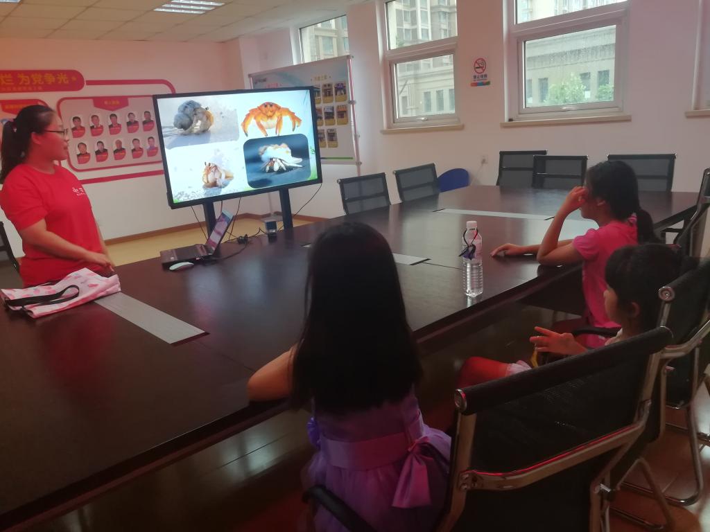 今天的宣传活动以海面以上、海洋表面、海底为基准,分别介绍了这三个层次所代表的海洋生物,海鸟、寄居蟹、海兔,以提问的形式调动孩子们的积极性,同时可爱活泼的描述使得课堂生动有趣,不枯燥无味。志愿服务团成员按照奖励式问答的方法,将知识潜移默化地授予孩子们,同时也规范了孩子们的上课纪律。可爱的动画片紧扣课堂内容,既吸引了孩子们的要求,又以一种全新的方式将所学内容进行复习,使得孩子们对于所学知识做到学过不忘。