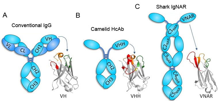 图1:A. IgG型抗体结构;B.驼类HcAb抗体结构;C.鲨鱼IgNAR抗体结构。